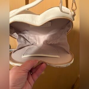 This elegant cream heart-shaped bag is perfect for adding a touch of sophistication to any outfit. Its unique design and versatile color make it a must-have accessory. Brand: LC Lauren Conrad. Brand new in perfect condition. I have one myself which I regularly wear to Disneyland and receive a lot of compliments. 6.25"H x 8.3"W x 2.25"D Crossbody strap length: 22"-24" 3" drop down handle length Zipper closure