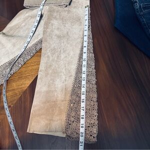 Cache Suede Pants with Hand Crochet Peekaboo Insert at Bottom Camel Tan Sz 2