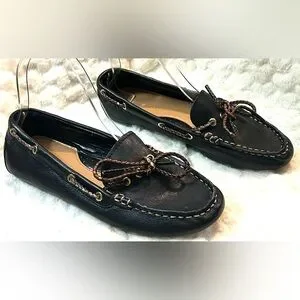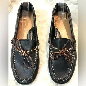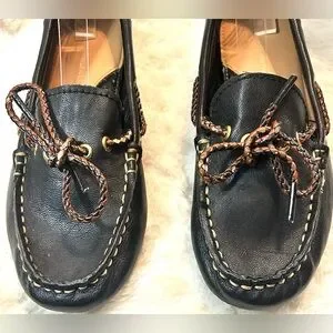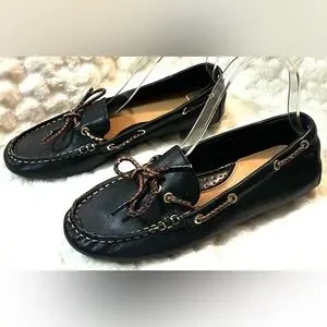 Tommy Hilfiger Randra black leather comfy flat slip on ballet moccasin boat shoe casual loafer women’s size 6.5M. Accentuated by white stitching braided laces and gold eyelets Perfect for everyday wear office school church party with pats dresses skirts shorts etc…
