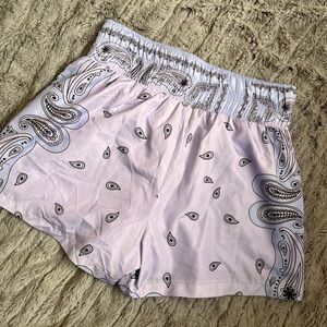 These athletic shorts are designed for comfort and performance, featuring a stylish purple and black color scheme. Made from a lightweight fabric, they offer a relaxed fit with an elastic waistband for easy wear. Ideal for workouts or casual lounging, these shorts provide both style and functionality.