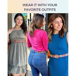 Features: Vibrant, multicolor woven fabric with a chic square leather buckle. Adjustable with 7 holes, perfect for cinching at the waist or worn lower on hips for a laid-back vibe. Made with durable vegan leather and sturdy woven material, ideal for everyday wear.