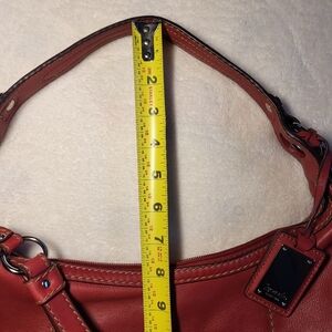 Super soft and buttery smooth red leather shoulder bag. High-quality material with shiny silver metal accents. Beautiful silky, colorful striped interior. Cool side pocket. Minimal use. Excellent condition. No obvious flaws.