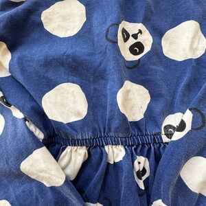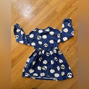 Adorable and comfy Hanna Andersson long-sleeve play dress featuring a navy background with allover white panda face print. Made from Hanna’s famously soft cotton with a gathered waist and twirly skirt — perfect for school, playdates, or everyday wear.