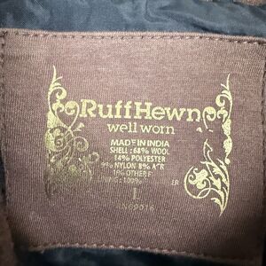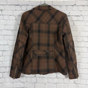 Ruff Hewn Full Zip Jacket Wool Blend Elbow Patch Womens L Brown Plaid Zip Pocket