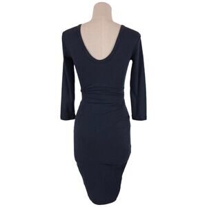 James Perse bodycon dress in deep teal green. Size 0 (extra small). This effortlessly cool dress features a bodycon fit, flattering side ruching, deep v neck, deep v back, and 3/4 length sleeves.