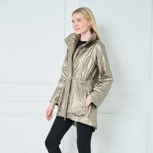 Chic, updated, elevated. The Metallic Anorak features matching rubberized hardware for a sleek look. This updated version features an adjustable drawstring waist on the interior and an adjustable hood. With larger hardware and a slightly longer length this style is durable and chic. The Anorak will be your "wear-all" for the elements of fog, rain, wind, and morning and evening chill