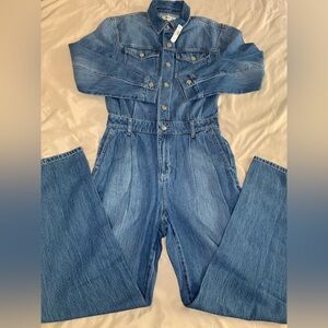 Stylish denim overalls by Madewell. Features button-up front and long sleeves. Perfect for casual wear.