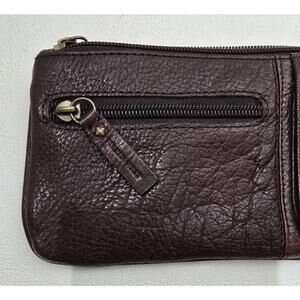 * Crafted from pebbled/textured lightly distressed leather, this zip-top wallet in a brown color features multiple credit card slots for organization-8 under the flaps & 2 inside the wallet
