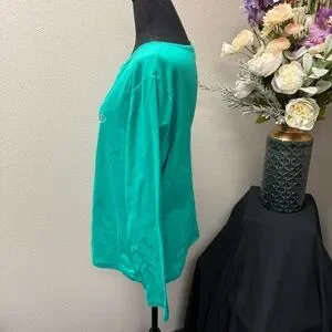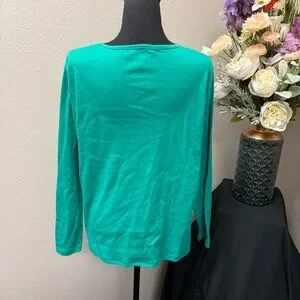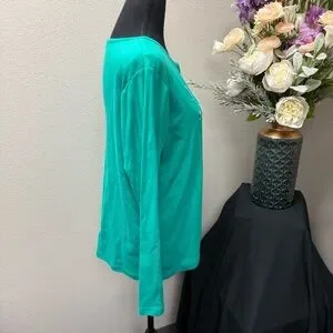 Festive Rebecca Malone long sleeve Christmas tee in size Large. Vibrant green cotton-blend fabric with an adorable embroidered Santa and snowman ice-skating design, accented with snowflakes. Perfect for holiday parties, cozy winter nights, or casual Christmas gatherings. Soft, comfortable, and cheerful—ideal for your festive wardrobe!
