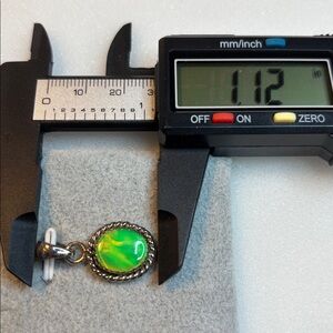 Green color aurora opal ( man made stone) pendant. See photos for measurements. No chain. Pendant only . Shows various colors of green yellow orange colors. Oval stone with a rope border . CJ 137