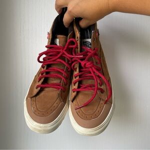 Elevate your look with Vans high-top Sk8-Hi MTE-2 sneakers. Tan upper with striking red laces. Stylish and comfortable for any occasion. Size Women's 6. Like new!