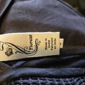 Floreat by Anthropologie Sun Dot blue midi dress with gold embroidered polka dots. Strapless with smocked back. Pit to pit measurement is 14.5 inches. The top of the dress is designed in a corset or bustier style and has light boning, with a structured, form-fitting shape that provides support without the need for straps. Side zip and has pockets. 100% cotton.