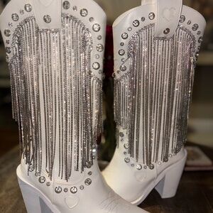Chic white boots with silver fringe and stud details. Elevate your look with these standout heels.