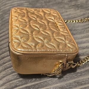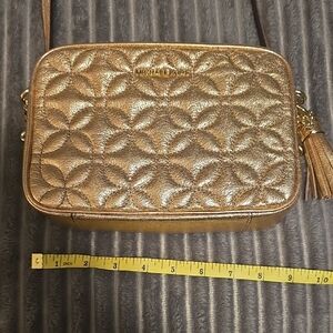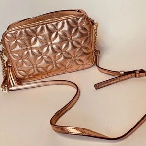 Chic crossbody with embossed floral design. Features a sleek strap and metallic accents. Ideal for stylish outings.