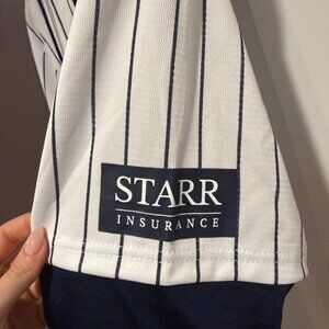 New York Yankees Jersey sewn into long sleeve hoodie. Features fake button-up front and long sleeves.