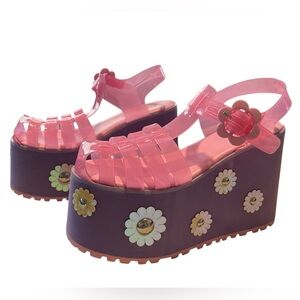 Vibrant pink and purple platform sandals featuring playful floral accents. Perfect for adding a fun touch to any outfit.