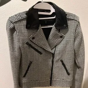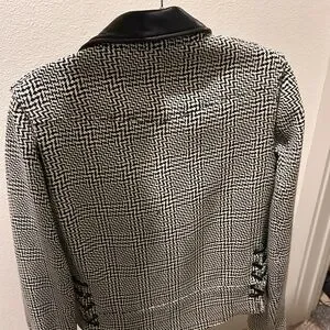 Stylish textured blazer with black accents. Features a modern design and sleek silhouette. Size 4. Best for Small/XS.