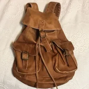 Stylish brown leather backpack with buckle details. Perfect for everyday use. Has some scuffs and marks and discoloration at bottom. See photos.