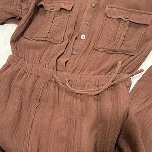 Stylish brown button-up jumpsuit with long sleeves and front pockets. Perfect for casual outings. Good condition