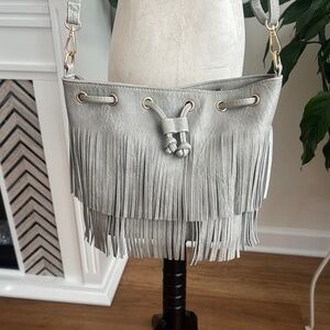Chic gray crossbody with fringe detail. Perfect for any occasion. Stylish and versatile. Bag in great condition except for a small spot on the bottom. Inside is clean with no spots or rips. Straps are in perfect condition no peeling or wear.
