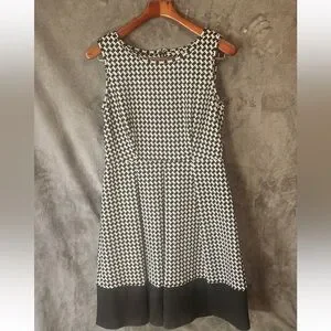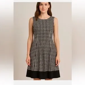 Elevate your wardrobe with this chic Calvin Klein houndstooth sleeveless dress. The classic black and white pattern offers timeless elegance for any occasion.