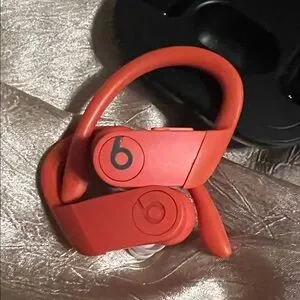 Vibrant orange wireless earbuds with a sleek black case. Working great.