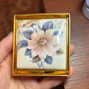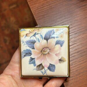 Elegant compact mirror featuring a floral design with a gold-tone frame. Perfect for on-the-go touch-ups. Vintage. Made in Japan. Comes in original box.