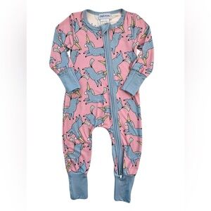 This bamboo zippy sleeper features a pink base with blue unicorns. Our bamboo zippies are functional, versatile, comfortable, cute, and designed in Canada.