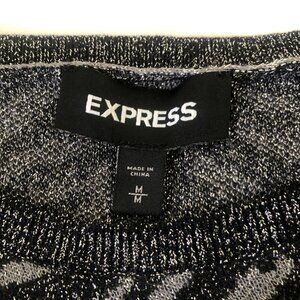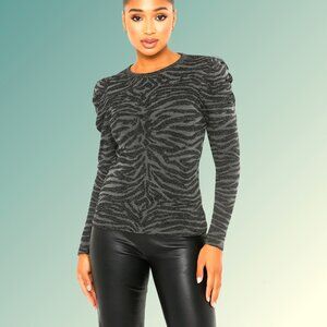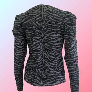 EXPRESS stylish zebra print in black and gray with subtle silver metallic thread. Soft Rayon/Nylon/ Metallic blend knit top, long ruched sleeves with puff shoulders. Excellent as new condition Never worn. Bust 34 Inch Length 21 Inch Labeled Sz M.