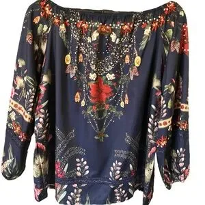 Stylish off-shoulder blouse. Features floral patterns. Perfect for casual outings.