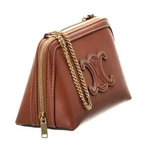 About the brand: Classic, coveted Parisian chic. Made in Italy Triomphe Leather Clutch On Chain in tan leather and gold-tone hardware with leather logo patch Interior design details: leather interior Measures 6in wide x 4in high x 3in deep Removable shoulder strap drops 22in Zipper closure Please note: All measurements were taken by hand and are approximate; slight variations may occur. Our products are 100% genuine. In some cases we purchase merchandise from trusted independent suppliers and not directly from the brand owner. In all cases we stand by the authenticity of every product sold on our site.