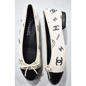 Chanel 23P White Black CC Coco Logo Cap Toe Bow Tie Ballet Ballerina Flat 39.5