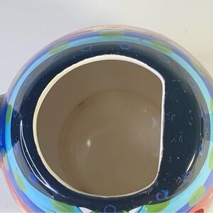 Bright, whimsical ceramic teapot from the Cat’s Meow line. Late 1990s to early 2000s era. Hand-painted with a red floral body, blue and green banding, and a bold black-and-white striped tail handle. The lid forms the cat’s head with cute ears. Sturdy, glossy finish that displays beautifully and serves well for tea time or cheerful kitchen decor. Very good condition and lid seats properly (see photos).