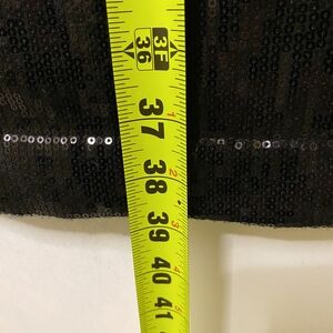 Black closely sewn mini sequins on black fabric sewn onto the front leg panels.