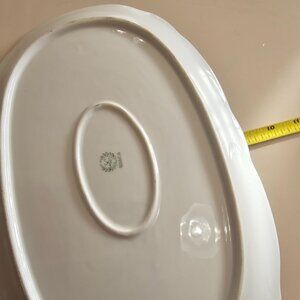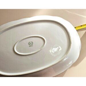 Elegant vintage Bavarian porcelain platter with a regency design, featuring a 14" oval shape, scallop edge, and gold trim. Perfect for serving or display.