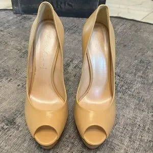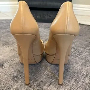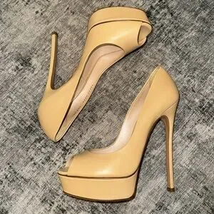 Make the streets your fashion runway with these spectacular pumps from Casadei. Chic in beige, these pumps are crafted from leather and feature a peep toe silhouette. They flaunt solid platforms, 6 inch heels and comfortable leather lined insoles. You'll look gorgeous when you wear them with your pantsuits and calf-length dresses.