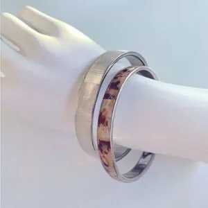 Mother of Pearl and tortoise shell bangle bracelet set in silver tone. In good condition.