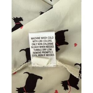 The Scottie Dog Tank Top in size M is a stylish and playful piece perfect for casual occasions. Made of comfortable polyester fabric with a scoop neckline and ruffled accents at the neck and down back, this tank top features a racerback design and is adorned with a charming animal print pattern of Scotty dogs. The cream and black color combination adds a trendy touch, making it a versatile option for the summer, fall, and spring seasons. Easy to care for with machine washable instructions, this top from Candie's is a must-have for any woman looking to add a touch of whimsy to their wardrobe.