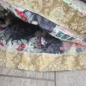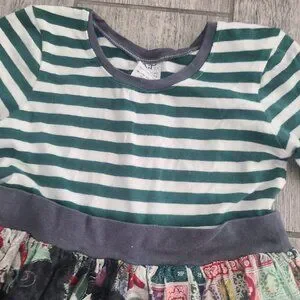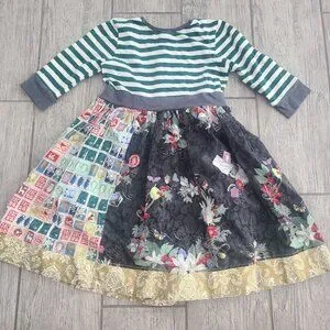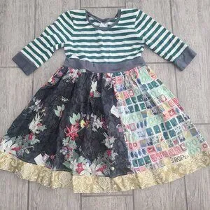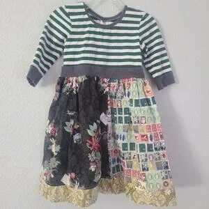 This stunning handmade-style holiday dress features a festive mix of prints and textures. The green and white striped bodice is paired with a gathered patchwork skirt showcasing a mix of vintage Christmas stamps, florals, and gold damask trim. Perfect for holiday photos, parties, or twirling by the tree!