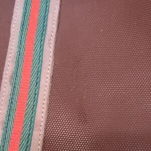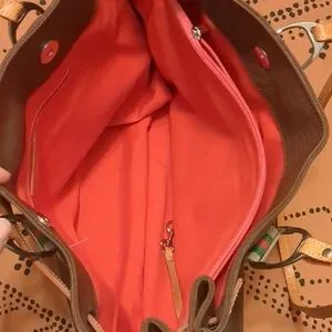 La Espuela Spanish designer collection purse. Stylish brown leather tote bag featuring tan straps and colorful accents. Hand made in Spain with equestrian inspired hardware. Fine Spanish vaquetilla leather is combined with pebble grain rubberized fabric.