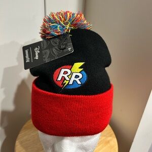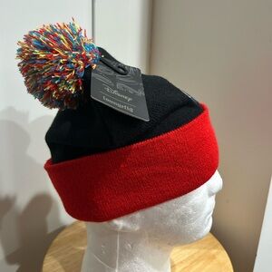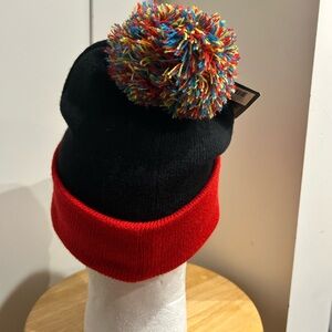 Stylish Loungefly beanie. Black and red design. Features colorful pom-pom. Embroidered logo detail.