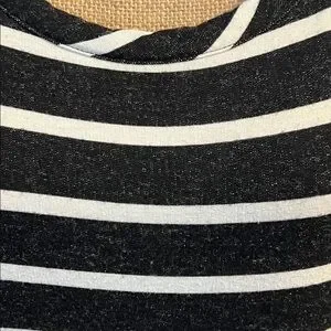 Elegant knitwear Dress by Talbots. Features a classic black and gray heather stripe on white. Exposed zipper on back. Long sleeves, small slits on each side and scoop neckline.