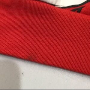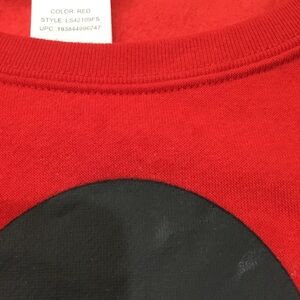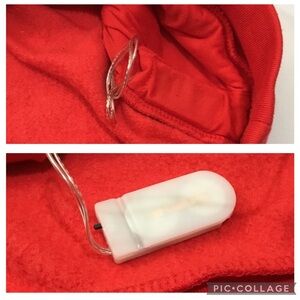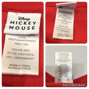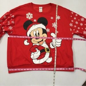 Disney Mickey Mouse Christmas sweatshirt with blinking lights. Size XL Juniors 15/17. Color is red with graphic on front of Mickey Mouse in Santa suit. White snow flakes on front and sleeves. Multicolored light bulbs blink on and off when turned on. Battery in small compartment near bottom hem with on off switch. Note: Front hem has a small dark stain. Front has some light stains - see last few pictures in listing for close ups of these issues.