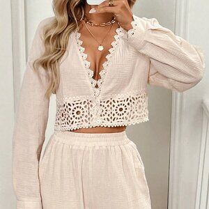 Apricot Casual Women's Fall Lace Splice Long Sleeve Cardigan And Pants