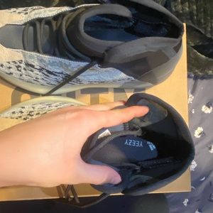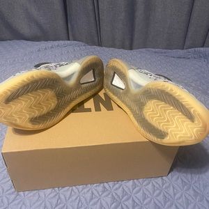 Stylish Yeezy sneakers. Features black and cream tones. Comfortable and trendy design.