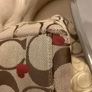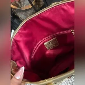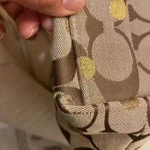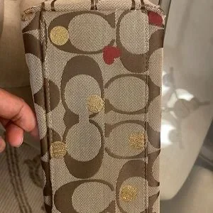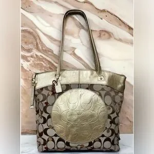 Stylish Coach tote with signature pattern. Features gold accents and spacious interior. Perfect for everyday use.Bag shows very little signs of wear . View all pictures then make me an offer .