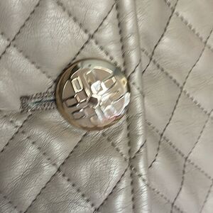 So cute and washable. Great faux quilted leather look taupe jacket. Buttons are adorable and there is a spare. The coat is new but doesn’t have tags. Great pockets. Great for Spring