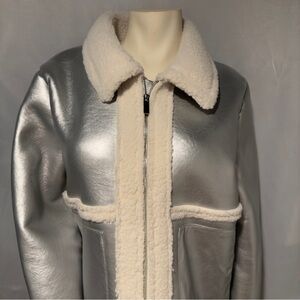 A vegan silver leather and faux shearling bomber jacket Never worn, new old stock without tags. Lining is the same ivory faux shearling fur as is the trim on the exterior of the coat.