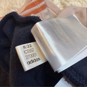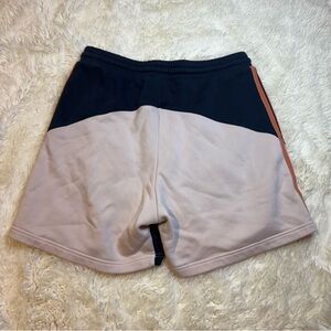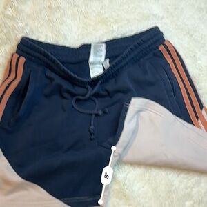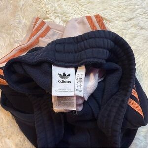 Stylish adidas athletic shorts. Features black base with orange stripes. Comfortable fit for active wear.