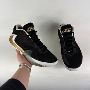 Coming to America. Elevate your game with the Nike Zoom Freak 1 Athletic Sneakers, a perfect blend of style and performance for the modern athlete. The sleek black synthetic upper is complemented by a distinctive cheetah print, making these sneakers a bold statement on or off the court. Designed for dynamic movement, the low top silhouette offers a comfortable fit with a standard shoe width and a lace-up closure for a secure feel. Crafted for a range of activities including gym training and running, the durable rubber outsole provides superior traction, while the fabric lining ensures breathability and comfort. The foam insole and arch support offer additional cushioning and stability, catering to your athletic needs whether you're sprinting or taking a casual stroll. With their versatile athleisure theme, these sneakers are suitable for both activewear and casual outings, ensuring you step out in both comfort and style.